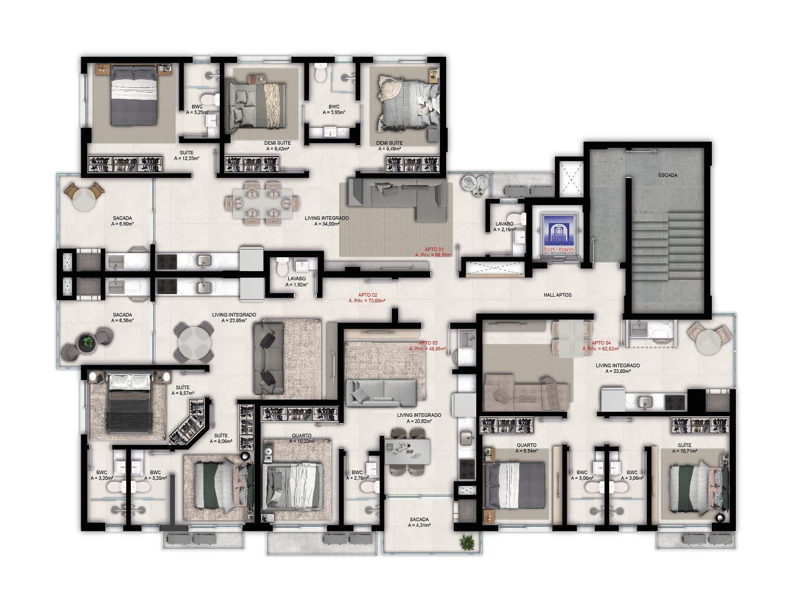 Tipo 1 com 98,36 m² privativo de apto